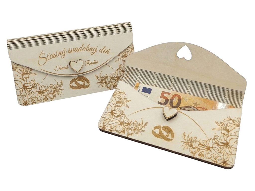 Drevená svadobná obálka na peniaze a priania